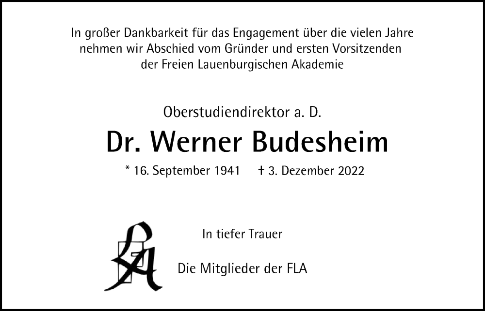 Wie die Akademie ohne ihren Gründer weiterarbeiten wird, ist noch unklar. Prof. Thomas Schramm, zweiter stellvertretender Vorsitzender, ist sich mit dem ersten Vize Pries einig: „Wir können uns im Moment nicht vorstellen, wie es mit der Lauenburgischen Akademie weitergehen soll. Denn Werner Budesheim hinterlässt so große Fußstapfen, dass sie für uns drei zusammen zu groß sind. Die Zukunft der Akademie hätten wir gern mit ihm zusammen geplant.“ Die Mitglieder werden Mitte Februar 2023 auf einer Versammlung darüber entscheiden, wie es nun ohne Werner Budesheim weitergeht.